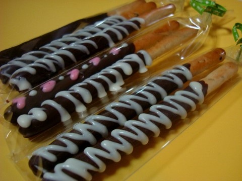 スティック状のお菓子(サルービアまたはごまスティック)を2本ずつ持ち、お菓子の上の部分からチョコレートを丁寧に塗っていきます。チョコレートがスティック全体に均一にコーティングされるように注意しながら、チョコレートを塗り終えたら、縦に持ち上げて余分なチョコレートをトントンと落としてください。お菓子の先端までチョコレートが付かないように、きれいに整えるのがコツです。