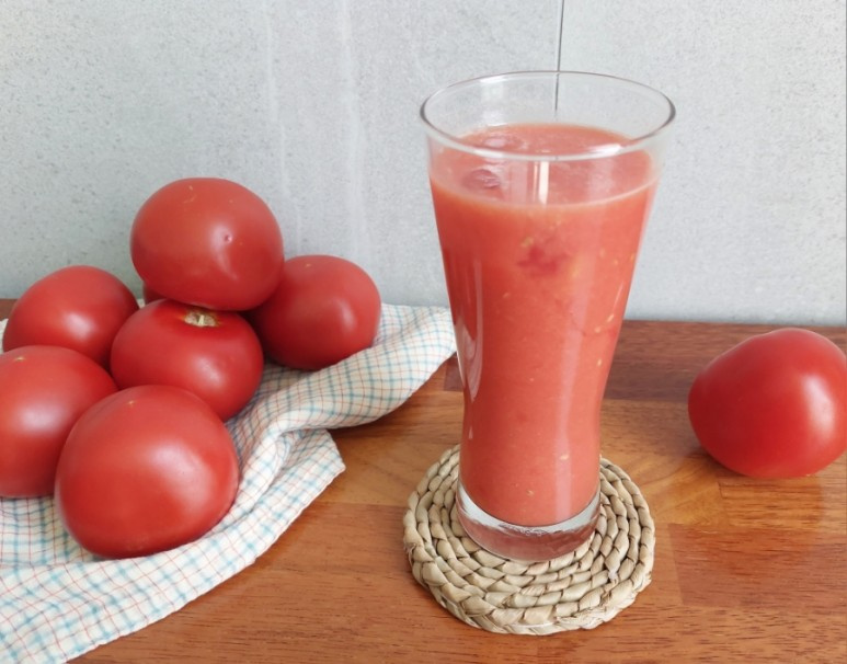 下準備のできたトマトをミキサーに入れます。ここに、甘みを加えるオリゴ糖または蜂蜜大さじ1/2と、トマトの栄養吸収を助け、ほのかな風味を加えるオリーブオイル大さじ1/2を一緒に加えます。ミキサーの蓋をしっかり閉め、滑らかになるまでしっかりと撹拌したら、新鮮で美味しい自家製トマトジュースの完成です!すぐにグラスに注いで、美味しくお召し上がりください。