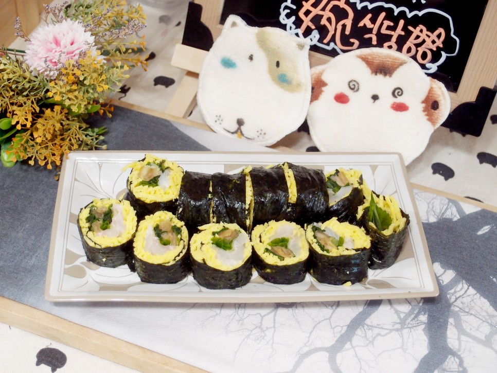 さあ、海苔の上にすべての材料を重ねていく番です。広げた卵焼きの細切りの上に、新鮮なマコガレイの刺身、香りの良いエゴマの葉、シャキシャキしたネギ、ピリッとしたキムチ、爽やかな甘酢生姜を乗せ、最後にわさびを少し添えます。次に、キンパのようにしっかりと巻いていきます。海苔の端に甘酢あん(または水)を少量つけると、海苔がしっかりとくっつき、ほどけずに形を保てます。海苔は切れにくいことがあるので、巻く前に包丁を一度研いでおくと、綺麗に切ることができます。