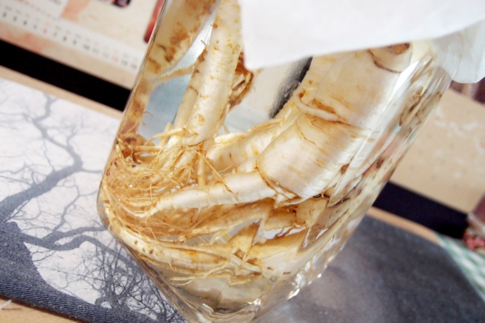 よく乾燥した高麗人参を使って、いよいよ人参酒を仕込む準備をします。どのようなお酒を使うかによって、人参酒の風味や保存性が変わってきます。