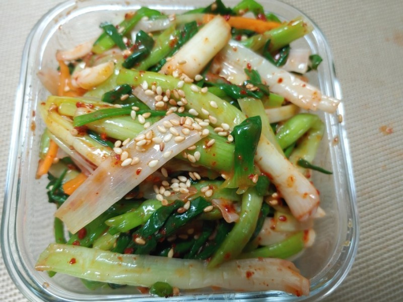 コチュカルの調味料がニラ(チョッパ)に均一に絡み、美味しそうに和えられたニラ(チョッパ)の和え物です。ピリ辛で甘い香りが食欲をそそります。