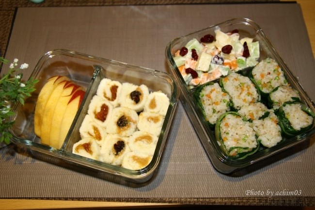 さあ、スイスチャードでライスラップを巻いていきましょう。準備したスイスチャードの葉を広げ、その上に約半膳分のご飯を乗せ、丸く握ります。スイスチャードの葉でご飯を包み込むようにきれいに巻き、食べやすい大きさに半分に切って、お弁当箱の仕切りに彩りよく盛り付けます。こうすることで、ご飯が崩れにくく、見た目もきれいに仕上がります。
