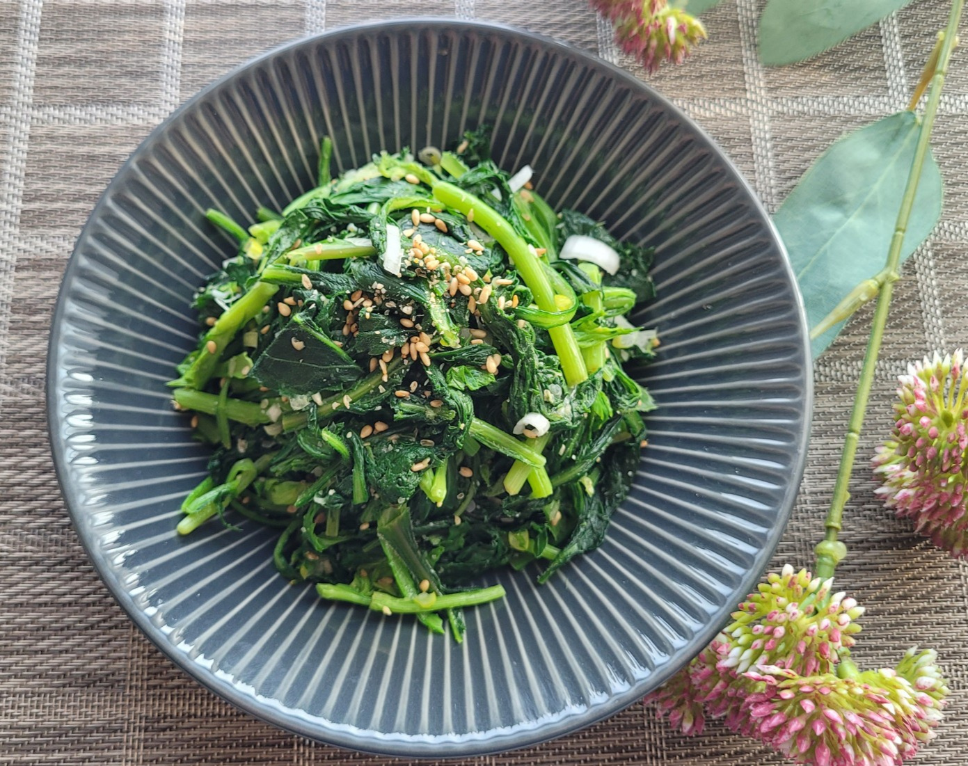 ボウルに切った摘み菜とみじん切りにした長ネギを入れ、準備した調味料を全て加えます。みじん切りニンニク小さじ1/2、塩小さじ1(味見をして調整してください)、ごま油大さじ1、そして香ばしさを加える炒りごま大さじ1/2です。