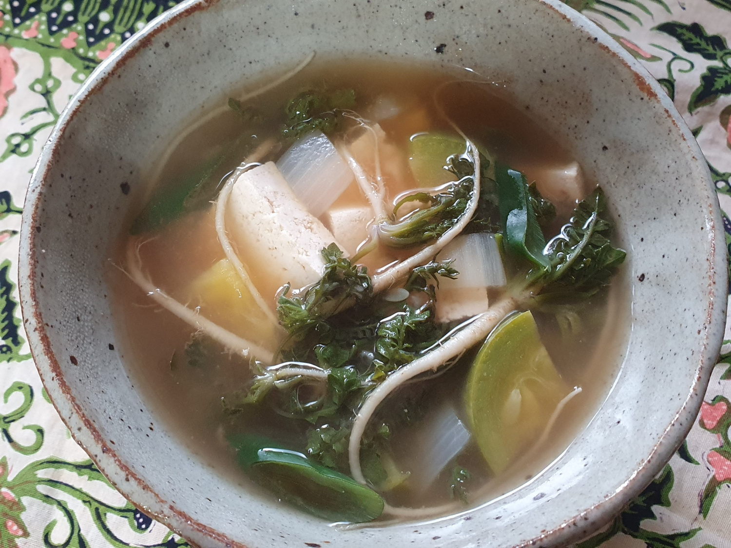 温かいお椀にきれいに盛り付ければ、香り高く美味しいヨモギ(ナギ)の味噌汁をいただく準備が整いました。ご飯一杯と一緒に、心も体も満たされる春の食卓をお楽しみください。
