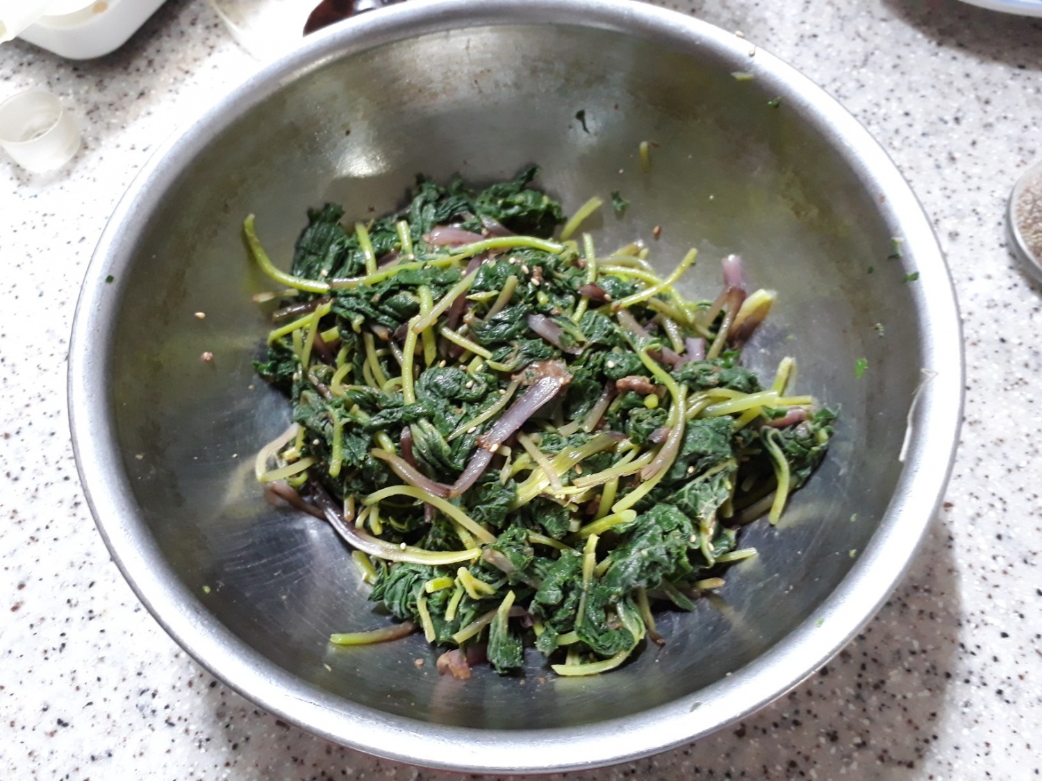 ボウルに下処理したよもぎを入れ、味噌大さじ1/2、風味豊かなえごま油大さじ1、香ばしい炒りごま大さじ1、そして風味を添えるためのこしょう少々を加えます。