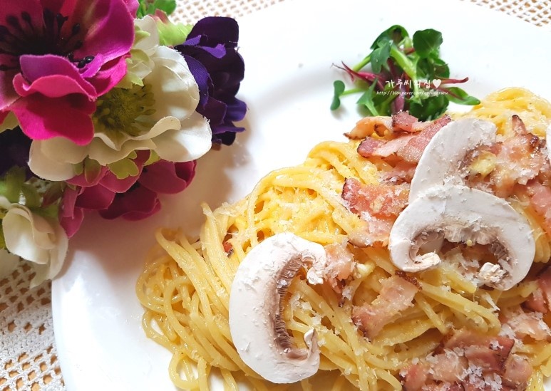 「カルボナーラ」という名前はイタリア語で「炭鉱夫」を意味するそうです!昔、炭鉱夫たちが肉と卵だけで手軽に作って食べていたのが始まりと言われています。卵黄を使うと「生臭くならないか?」と心配されるかもしれませんが、まったく心配いりません!香ばしく焼かれたベーコンの深いコクと、新鮮な卵黄のまろやかさが絶妙に絡み合い、意外にもあっさりしていながらも、驚くほど濃厚でクリーミーな味わいになるんです。薄切りにしたマッシュルームは、食感のアクセントになり、さらに美味しさを引き立てます。ご自宅で、まるでレストランのような本格カルボナーラをぜひ作ってみてください!