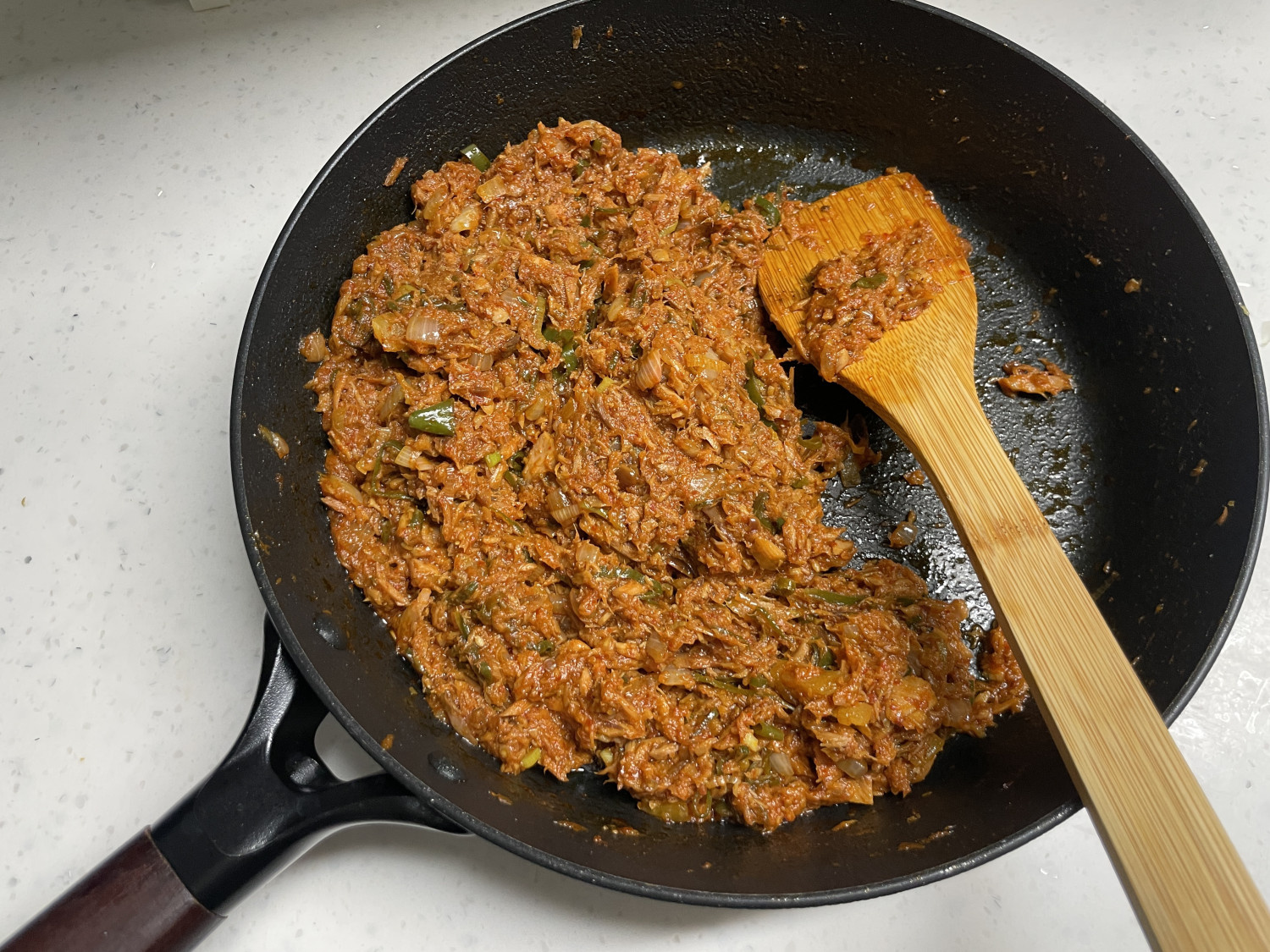次に、炒めた野菜とニンニクに、残りの材料をすべて加えます。ツナ缶は油を軽く切って(油を全部捨てなくても大丈夫です)、缶から取り出してフライパンに入れます。そこにサンジャン大さじ2、コチュカル大さじ2、イワシエキス大さじ1、白砂糖小さじ1を加え、中火に落として10分から15分ほどさらに炒めます。サンジャンが焦げ付かないように、時々よく混ぜてください。材料が馴染み、照りのあるサンジャンが完成します。