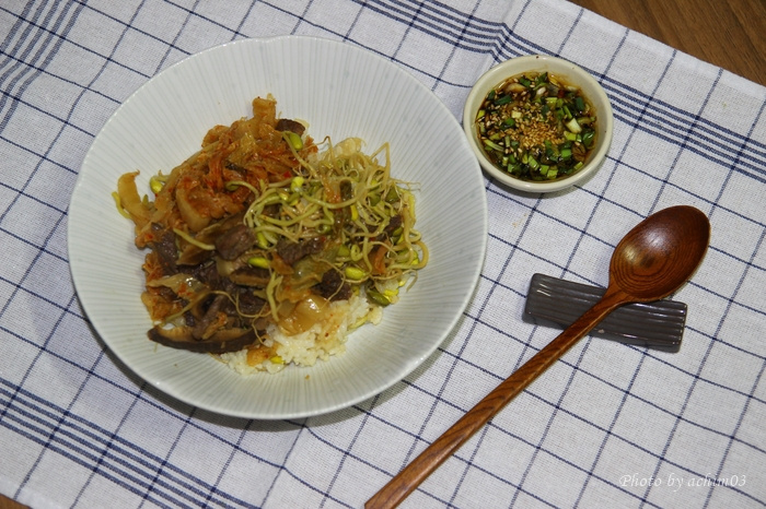さあ、もやしご飯を炊く準備をしましょう。炊飯器にお米を研いでセットし、その上に準備したもやし、下味をつけた牛肉、しいたけを順に乗せます。最後に、味付けしたキムチをかぶせます。水加減は、普段より10%ほど少なめにすると、べたっとせずパラッとしたご飯に仕上がります。