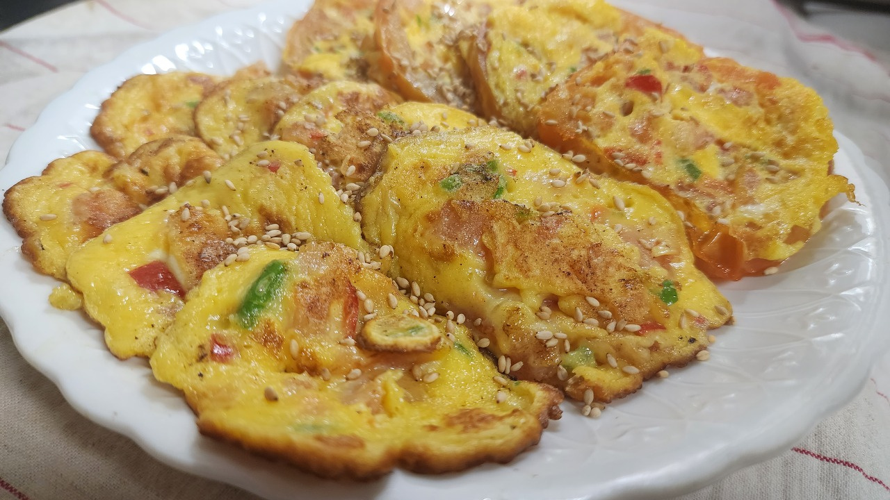 トマトの輪の中に生地が余った場合は、スプーンで生地をすくい取り、フライパンの上に丸く落として一緒に焼きます。小さいお焼きのように焼くと、より豪華に仕上がります。トマトのお焼きと一緒に焼いた小さな生地も、両面がきつね色になったらお皿に盛り付けます。