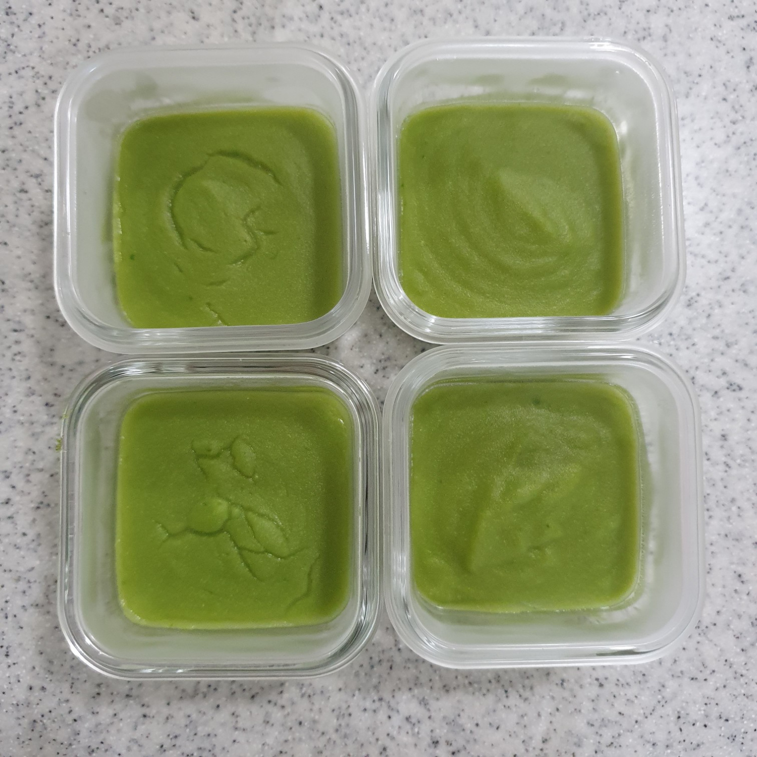 美味しい牛肉とチンゲン菜の離乳食が、とろりとした仕上がりになりました!これを離乳食用容器に移して冷まします。全体の量は約425gになります。一度に食べる量として、100mlずつ小分けにすることをおすすめします。赤ちゃんの食べる量に合わせて、量を調整してくださいね。