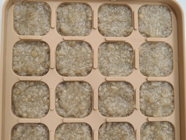 よく蒸えたえのき茸を冷まし、赤ちゃんの離乳食キューブに15gずつ小分けにして入れていきます。キューブに入れた離乳食は、すぐに冷凍保存して新鮮さを保ちます。このように小分けにしておくと、必要な時に必要な分だけ手軽に取り出せて便利なので、離乳食作りの時間を大幅に短縮できます。