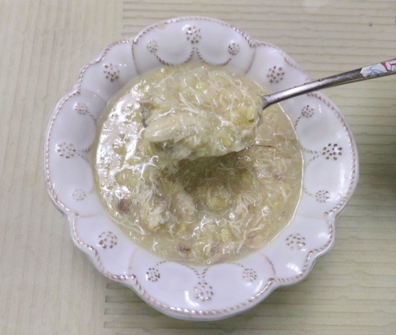 さらに約20分ほど煮込むと、鶏肉と緑豆が滑らかに溶け合い、まるでカニのお粥のように細かい粒感が残る、とても柔らかく濃厚な鶏肉と緑豆のお粥が完成します。温かいスープと一緒に、満足感のある一食をお楽しみください。お好みで塩、こしょうで味を調えると、さらに美味しくいただけます。