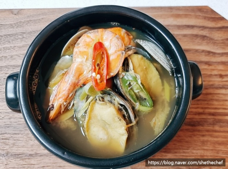 アサリがある程度火が通ったら、準備しておいたエビとアワビを一緒に入れます。新鮮な海の幸が、チゲを一層豊かにしてくれるでしょう。