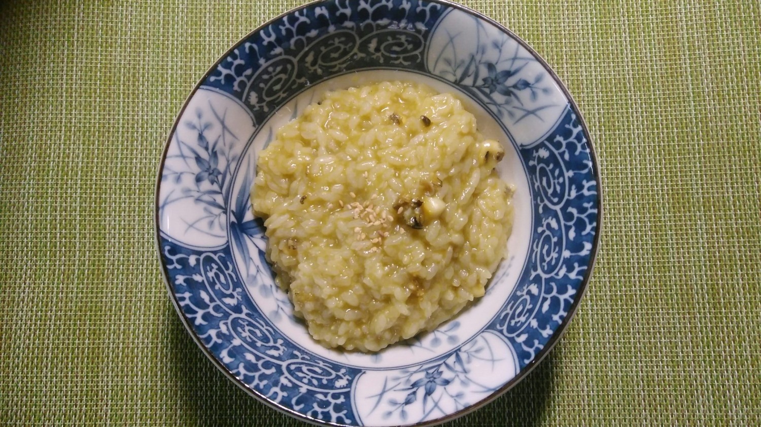 食欲をそそる美しい色合いのあわび粥が完成しました。ごま油の香ばしい香りと、あわびのほのかな香りが合わさり、鼻腔をくすぐり食欲を掻き立てます。この香りだけで、体が元気になっていくような気分になります。