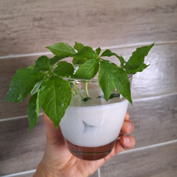 最後に、取っておいたスプラウト人参(セルト)の葉を、ミキサーにかけずにラテの上にそっと乗せて飾ります。まるで小さな庭園のような、美しい見た目が完成します。これで、香り高くヘルシーなスプラウト人参(セルト)ラテの出来上がりです!出来立てが一番美味しいので、すぐに召し上がってください。