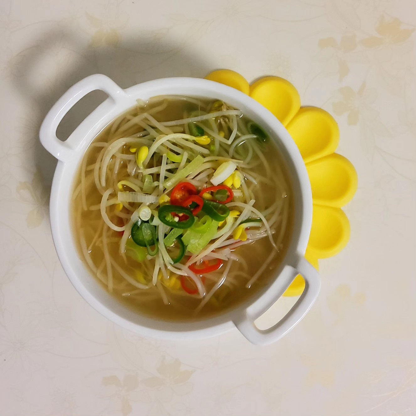 はい、これで澄んだ味わい、爽やかな風味、そして深い旨味をもつエビの塩辛もやしスープの完成です!温かいご飯と一緒にいただけば、体も心も温まる、美味しい一膳になること間違いなし。ぜひ作ってみてくださいね!