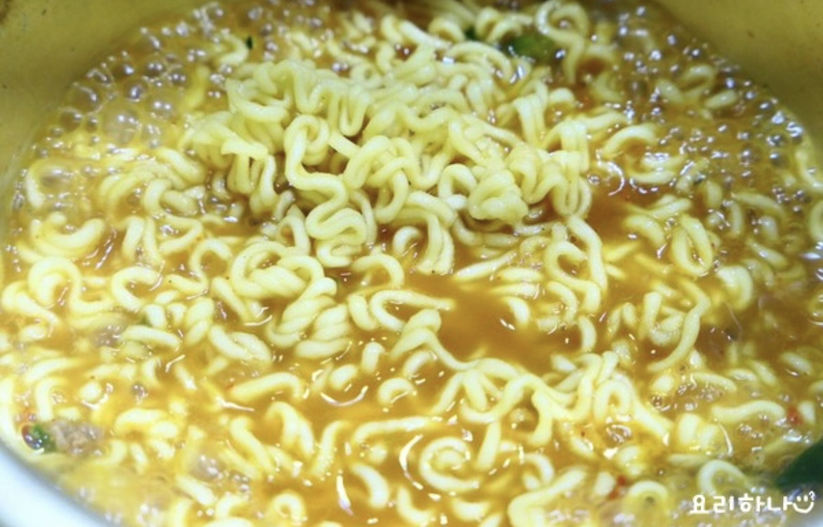 牛骨スープがしっかりと沸騰したら、ラーメンの袋に入っているかやく(具材パック)と粉末スープをすべて加えます。このレシピでは「辛ラーメン」を使って牛骨ラーメンを作ってみました。お好みのラーメンを使っても良いのですが、辛ラーメンは牛骨スープとの相性が抜群で、さらに深い風味を引き出してくれます。