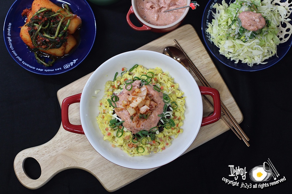 さあ、いよいよ丼を盛り付けましょう!ご飯の上に、先ほど作った温かいスクランブルエッグをきれいに乗せ、その上から風味豊かな明太子マヨソースをたっぷりとかけます。刻んだネギの青い部分を散らして飾りましょう。最後に、細かく刻んだキムチを彩りよく乗せれば、見栄えもする明太子マヨ丼の完成です!