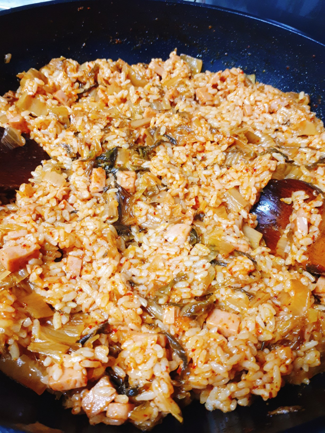 キムチの漬け込みが終わった後、余った熟成キムチを早く使い切りたいと思い、子供たちも大好きなスパムを加えて簡単なチャーハンを作ってみました。手軽で満足感のある一食にぴったりです!酸味のある熟成キムチと塩辛いスパムの組み合わせが絶品です。