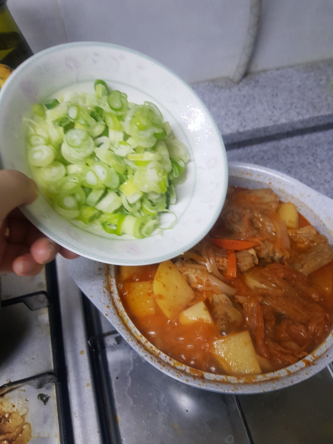 キムチ鍋がぐつぐつと煮立ってきたら、じゃがいもが柔らかく煮えるまで中火で約15〜20分ほどさらに煮込みます。時々、鍋の中身をかき混ぜながら煮汁をかけたりすると、具材に味が均一に染み込んでより一層美味しくなります。