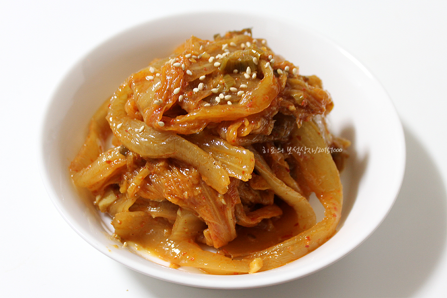 熟成キムチは中の具材があれば取り除きます。芯の部分は切り落とし、キムチを縦に食べやすい大きさに裂いて準備します。包丁で切っても良いですが、使い捨て手袋をして手で裂くと、味がよく染み込み、食感も良くなります。