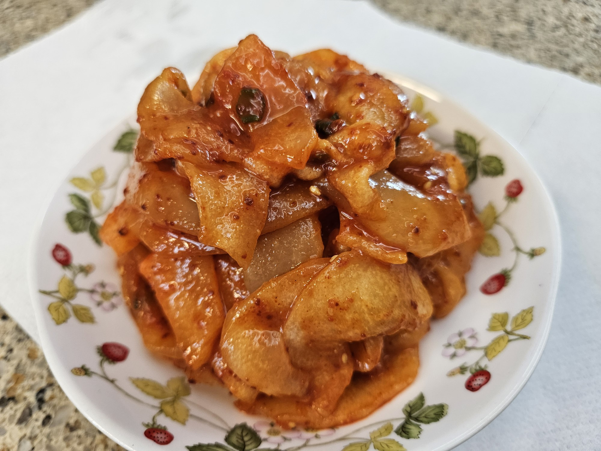 水分をしっかりと絞ったノガッを調味料のボウルに入れ、優しく全体が均一に混ざるように和えていきます。これで、シャキシャキとした食感と、甘酸っぱい風味がたまらない、絶品のノガッムチムが完成です!すぐに食べても美味しいですが、冷蔵庫で冷やして食べると、さらに爽やかさがアップしますよ!