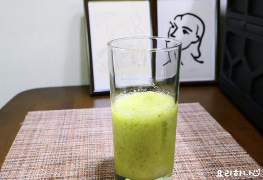 じゃーん!見た目にも健康的なきゅうりリンゴジュースが完成しました。リンゴを結構多めに入れたせいか、きゅうり特有の香りは控えめで、リンゴの甘みがより豊かに感じられました。きゅうりが入っていると伝えないと、気づかないくらいリンゴの存在感が際立っていましたよ。