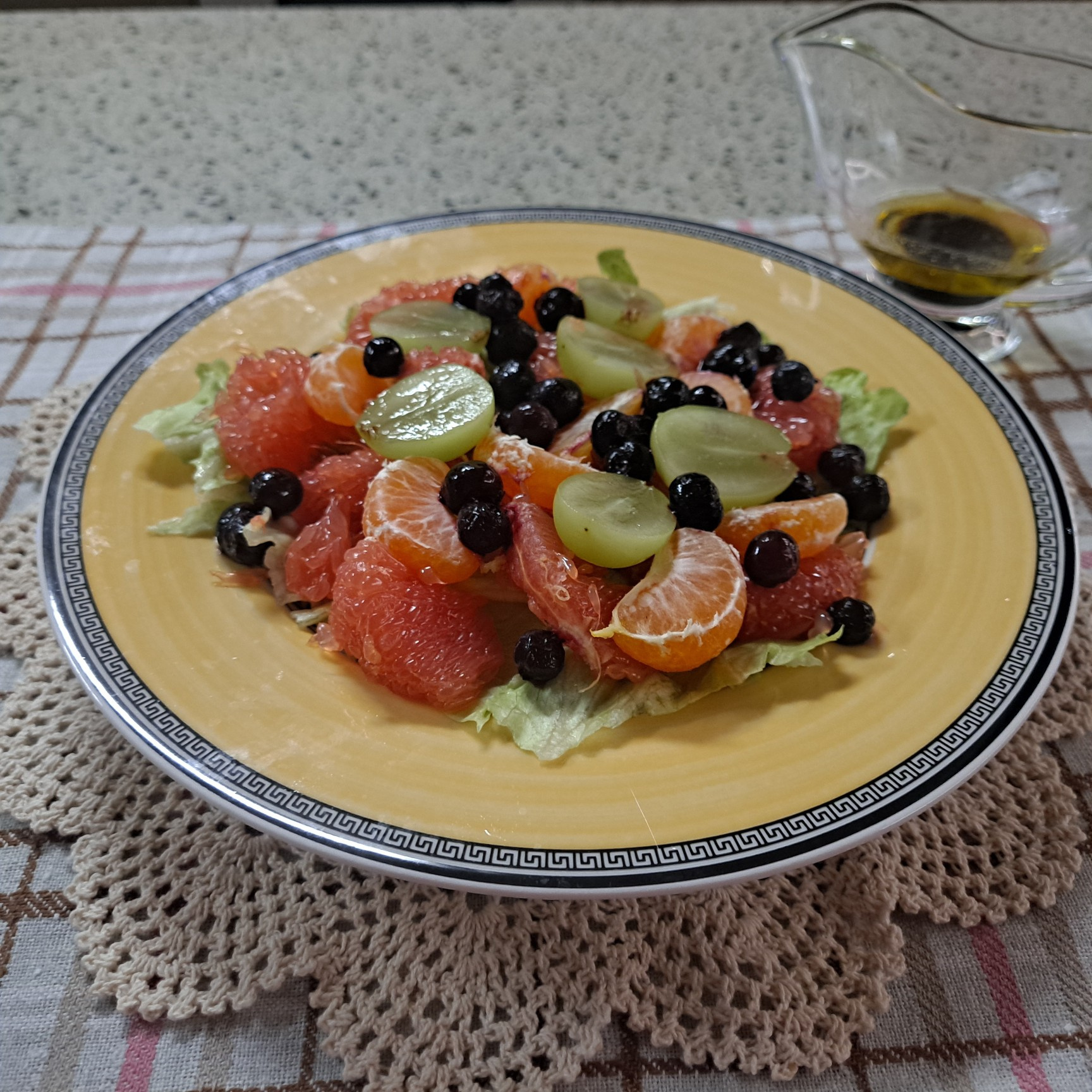 グレープフルーツの上に、半分に切ったシャインマスカット、皮をむいたみかん、そして新鮮なブルーベリーを色とりどりに飾りましょう。冷蔵庫にある他の旬のフルーツ(いちご、キウイ、オレンジなど)を使っても素晴らしいサラダが完成するので、自由にアレンジしてみてください!