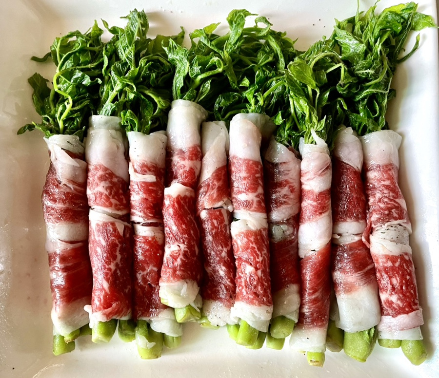 解凍の確認:山菜を牛バラ肉に全て巻き終わると、この間に牛バラ肉は自然に完全に解凍されます。これで焼く準備が整いました。
