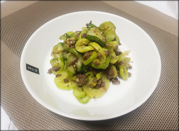 牛ひき肉には、醤油、砂糖、料理酒、ニンニクのみじん切り、こしょうをすべて加えてよく混ぜ、しばらく寝かせます。肉200gに対してニンニク大さじ1を入れると風味が格段に増しますが、お好みで量を調整しても良いでしょう。このように事前に下味をつけておけば、炒める際に別途ニンニクを追加する必要がありません。キュウリ自体にも塩味が付くため、牛肉の味付けは濃すぎず、ほんのりとした風味になる程度にしてください。プルコギの味付けに似ていますが、長ネギとごま油は炒める時に加える予定なので、ここでは省略しても大丈夫です。