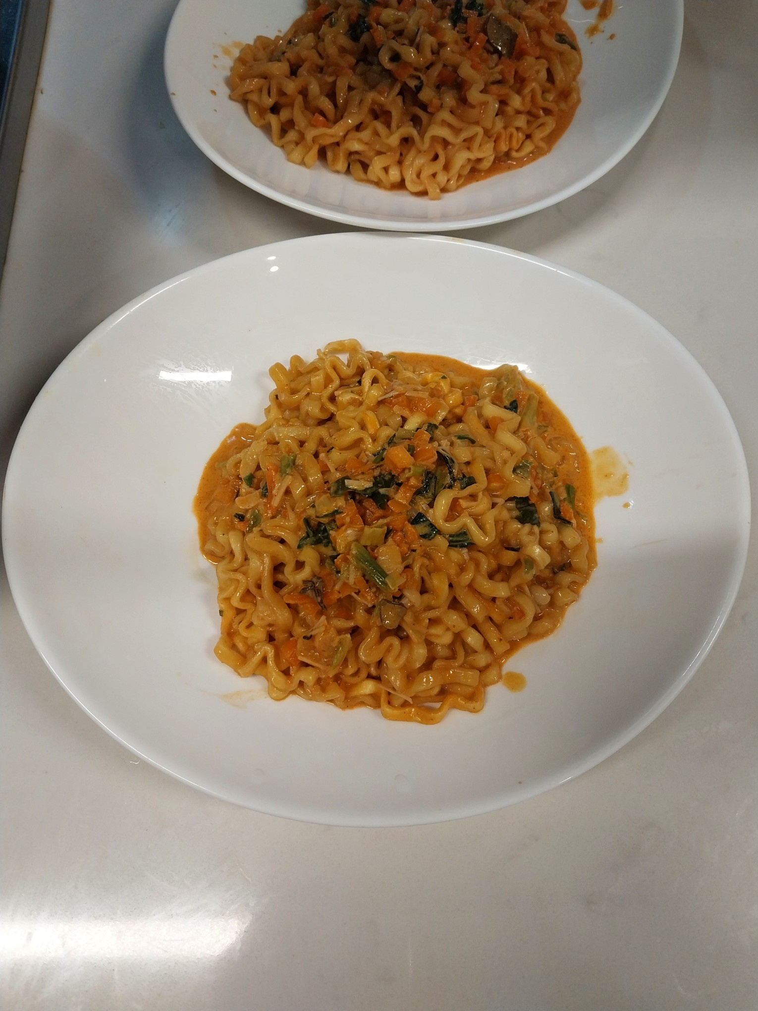 次に、スープのベースを作ります。炒めたにんじんに水100mlと牛乳200mlを加えます。牛乳を加えることで、スープが驚くほどまろやかでクリーミーになります。ラーメンに付属の乾燥野菜(かやく)もここで加え、強火で沸騰させます。沸騰したら弱火にしてください。