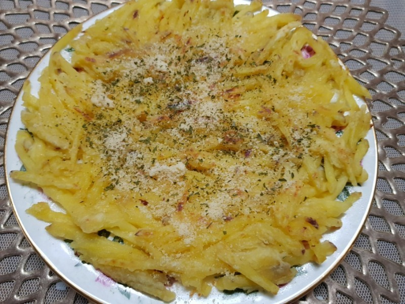 両面がきつね色に焼けたら、完成したさつまいもチヂミをお皿に盛り付けます。その上からパルメザンチーズパウダーとパセリフレークをたっぷり振りかけると、香ばしくて甘い風味が満載の特別なさつまいもチヂミが完成です!温かいうちに召し上がるのが一番美味しいですよ。