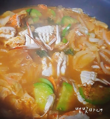 ベースのスープが沸騰したら、水気を切った蟹と準備した玉ねぎ、ズッキーニ、エゴマの葉、ニンニクみじん切り、コチュカルをすべて加えます。材料を入れたら蓋をして、中火で10分間煮込みます。10分後、蓋を開け、蟹と野菜が完全に火が通るまで5〜10分ほどさらに煮込めば、美味しい渡り蟹チゲの完成です。途中で味見をして、薄ければエキスや塩を加えてお好みの味に調整してください。