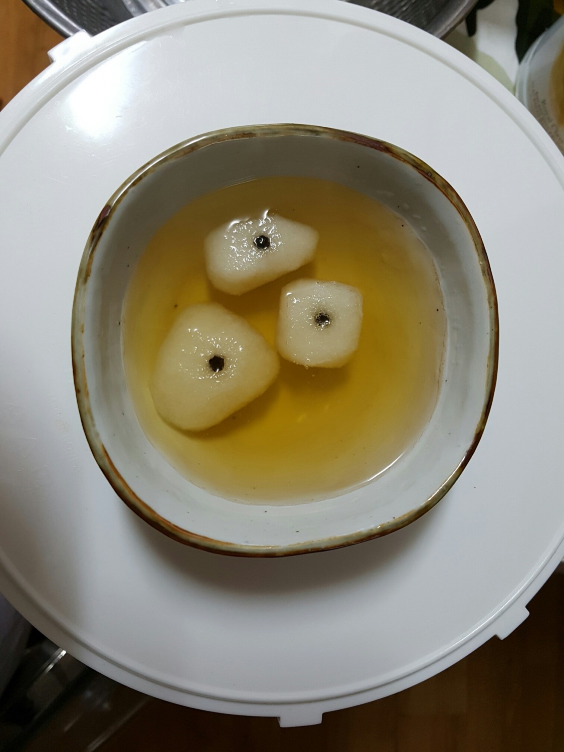 梨はきれいに洗い、皮をむいて、食べやすい大きさにカットし、角を丸く整えます。梨の中心部分に菜箸などで穴を開けて準備します。この穴は、ホールブラックペッパーを挿し込むためのものです。