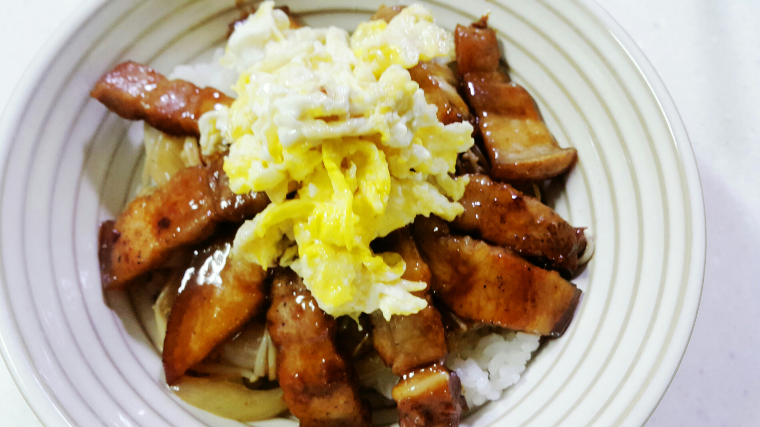 最後に、ふんわり作ったスクランブルエッグを彩りよく乗せたら、家族みんなが大好きになる、絶品豚バラ丼の完成です!どうぞ召し上がれ!