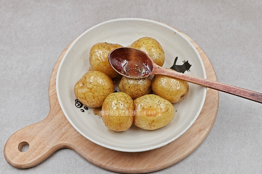 準備したじゃがいもを鍋に入れ、じゃがいもの約半分が浸るくらいの水を加えます。そこに塩小さじ1.5〜2と、砂糖(1回目)1/3カップ(韓国の紙コップ基準、約70g)を加えて強火で煮込み始めます。塩はじゃがいもの味を調え、最初の砂糖は煮物の基本的な甘さを加えます。