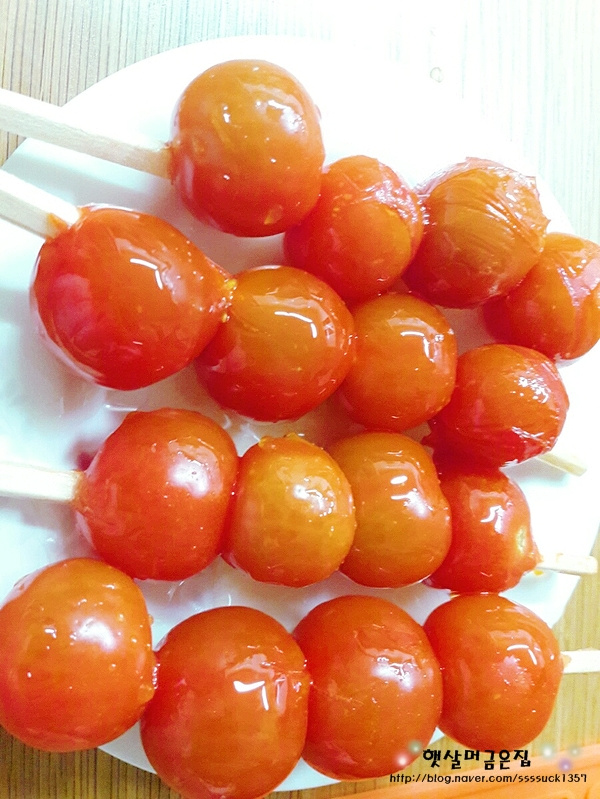 じゃーん!美味しいトマト飴(탕후루)の完成です!外はサクサクとした甘い砂糖コーティング、中は新鮮でジューシーなトマトの風味が絶妙にマッチして、本当に魅力的です。口の中で感じる食感がたまりません。ぜひ、召し上がれ!