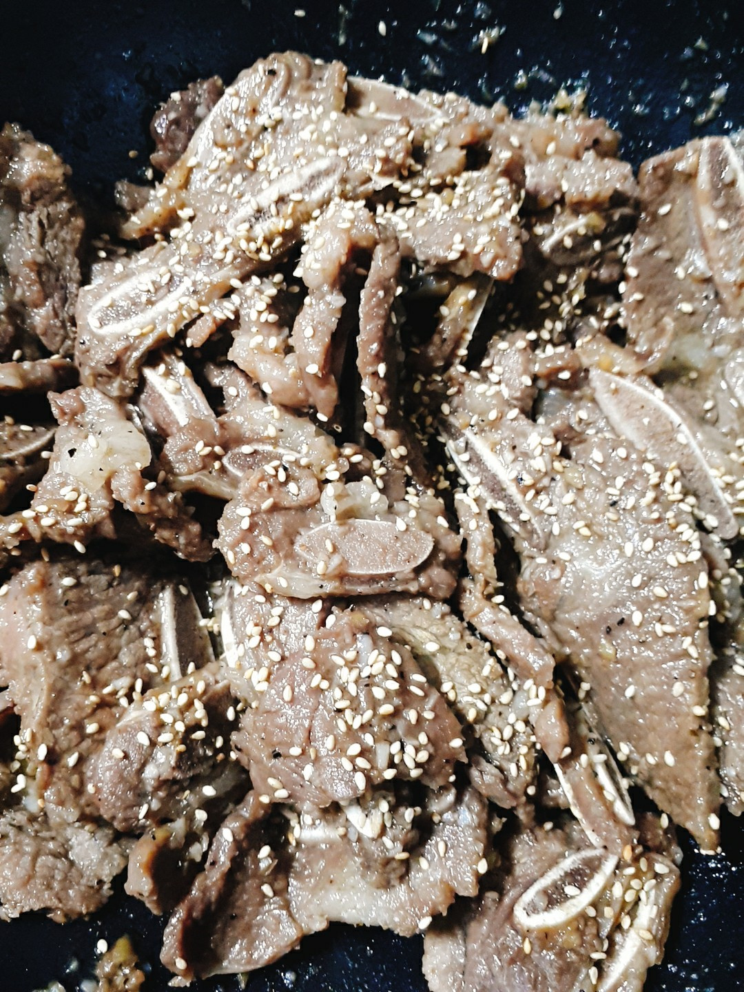 カルビが調理される過程で、自然な肉汁が放出され美味しいソースができますので、余分な水を加える必要はありません。中弱火で、焦げ付かないように時々かき混ぜながら、肉汁が煮詰まってカルビに美味しく絡み、肉が完全に火が通るまで調理を続けてください。最後に味見をして、必要であれば塩、砂糖、またはオリゴ糖を加えてお好みの味に調整してください。