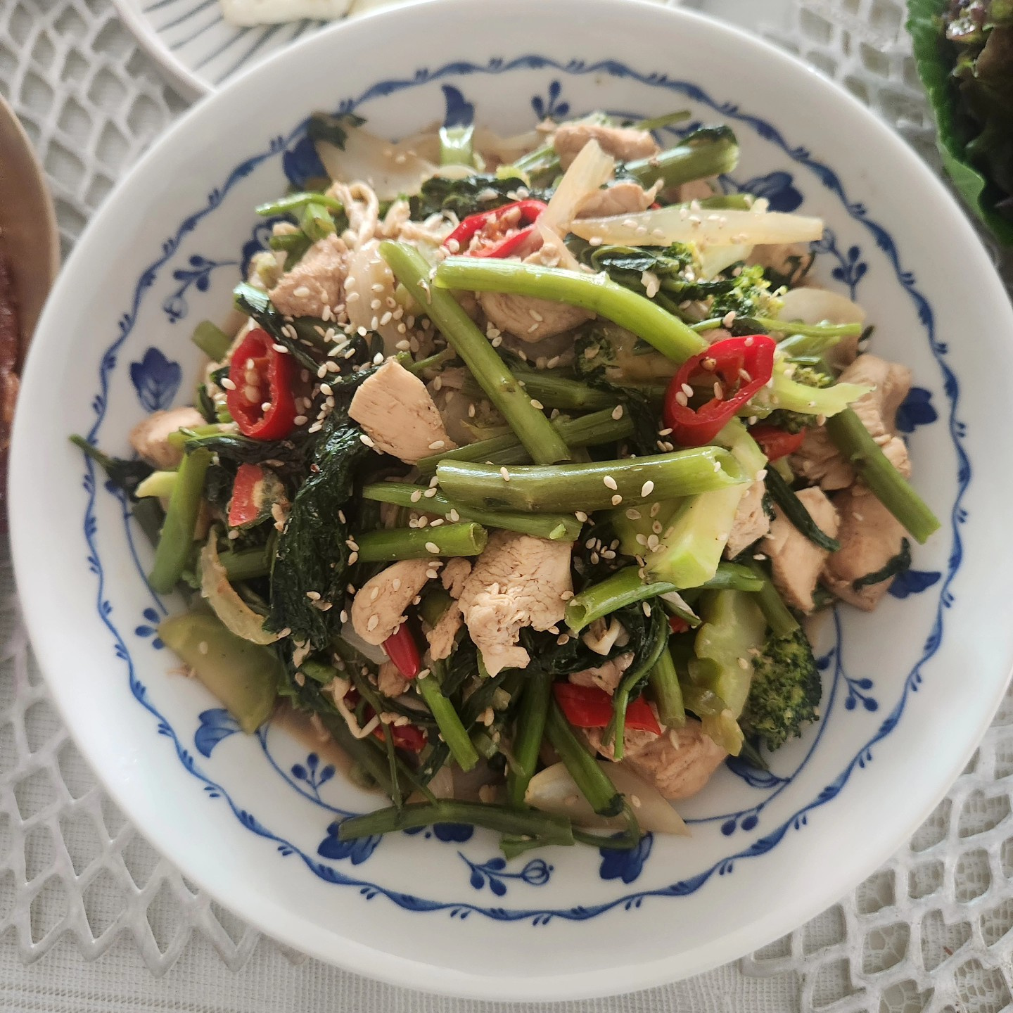 食感がたまらない!空芯菜と鶏むね肉の炒め物:食物繊維たっぷり!