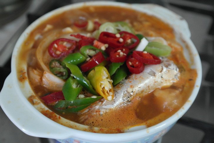 準備したヤンニョムを鍋全体に均等にかけます。切った青唐辛子、赤唐辛子、長ねぎを上に乗せたら、蓋をして中弱火で、キムチが柔らかくなり、味がよく染み込むまでじっくり煮込めば、おいしいサバのキムチチムの完成です。