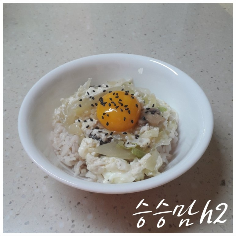 ごま油をかけたご飯の上に、先ほど作った温かい卵白と野菜が混ざった美味しいタレをたっぷりとかけます。中央には、慎重に分けた卵の黄身をそっと乗せると、見た目もより食欲をそそる仕上がりになります。