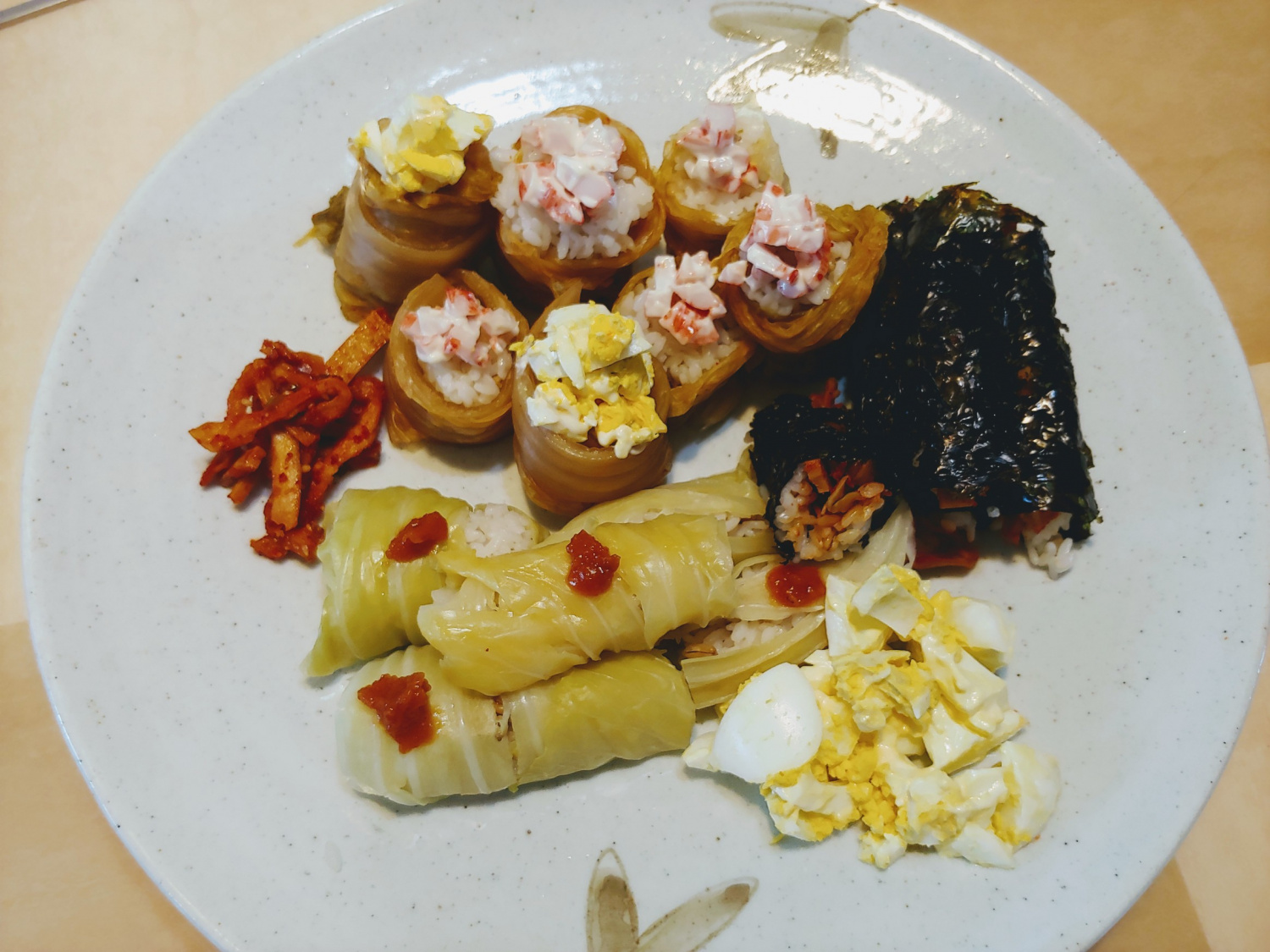 それでは、包んでいきましょう。キムチの上にお好みの具材を乗せ、くるくると巻きます。蒸したキャベツはサムジャン(韓国のつけだれ)を添えて食べやすいように包んでください。干し大根は、ミニキンパのように丸く巻いて、フィンガーフードとして楽しむのにぴったりな形にしましょう。