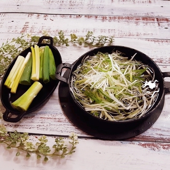 ネギの葉の部分は、一枚ずつ剥がれるので、半分に切ってから3〜4枚重ねて一度に切ると、時間を短縮できます。このように薄くスライスしたネギは、辛味を抜くために冷水に5〜10分ほど浸けてから、しっかりと水気を絞って、お好みの調味料で和えていただくと、とても美味しくいただけます。