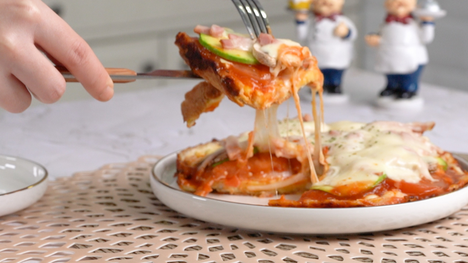 卵が半熟状になったら、その上にトマトソースを大さじ2〜3杯ほど薄く塗ります。その上に、準備しておいた玉ねぎ、ズッキーニ、トマト、マッシュルーム、ベーコンなどの具材を彩りよく並べます。最後に、ピザ用チーズをたっぷりとかけてください。全てのトッピングを乗せたら、再び蓋をして、ごく弱火でさらに約5分間加熱します。チーズが溶けて、中の具材が完全に火が通ったら、美味しい卵のピザ風おやつの完成です!焦げ付きを防ぐために、火加減は極弱火を維持することが重要です!