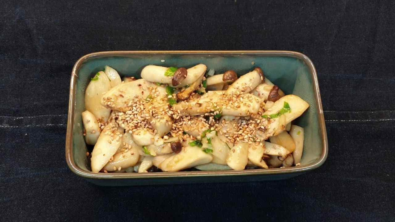 香ばしいごまで風味豊かに仕上げる:エリンギが程よく炒まり、水分がほとんどなくなったら火を止めます。最後に、ごま油大さじ1を回し入れて香りをつけ、白ごま大さじ1を全体に振りかけて仕上げます。ごまは指先で軽くすり潰して加えると、より一層香ばしくなります。出来立てのきのこ炒めを、温かいご飯と一緒にお召し上がりください!