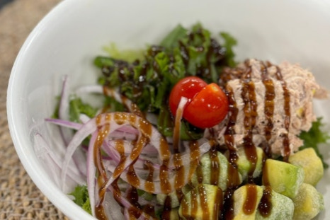 さあ、盛り付けです。器にご飯をたっぷり盛り、その上に準備したツナポキ、紫玉ねぎ、アボカド、チコリを彩りよく乗せてください。最後に、お好みの量の照り焼きソースをかけたら、口いっぱいに広がる新鮮な風味と旨味がたまらないマグロポキ丼の完成です!よく混ぜてお召し上がりください!