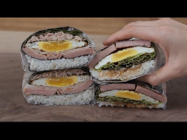切った海苔の片面に、味付けしたご飯を薄く広げます。ご飯を塗らなかった残りの3面には、用意した具材(ツナマヨまたはキムチスパム)をきれいに並べます。具材を入れすぎると折りたたみにくくなるので、適量にしてください。ツナの場合は、エゴマの葉、スパム、大根の甘酢漬け、マヨネーズ、薄焼き卵を重ねます。