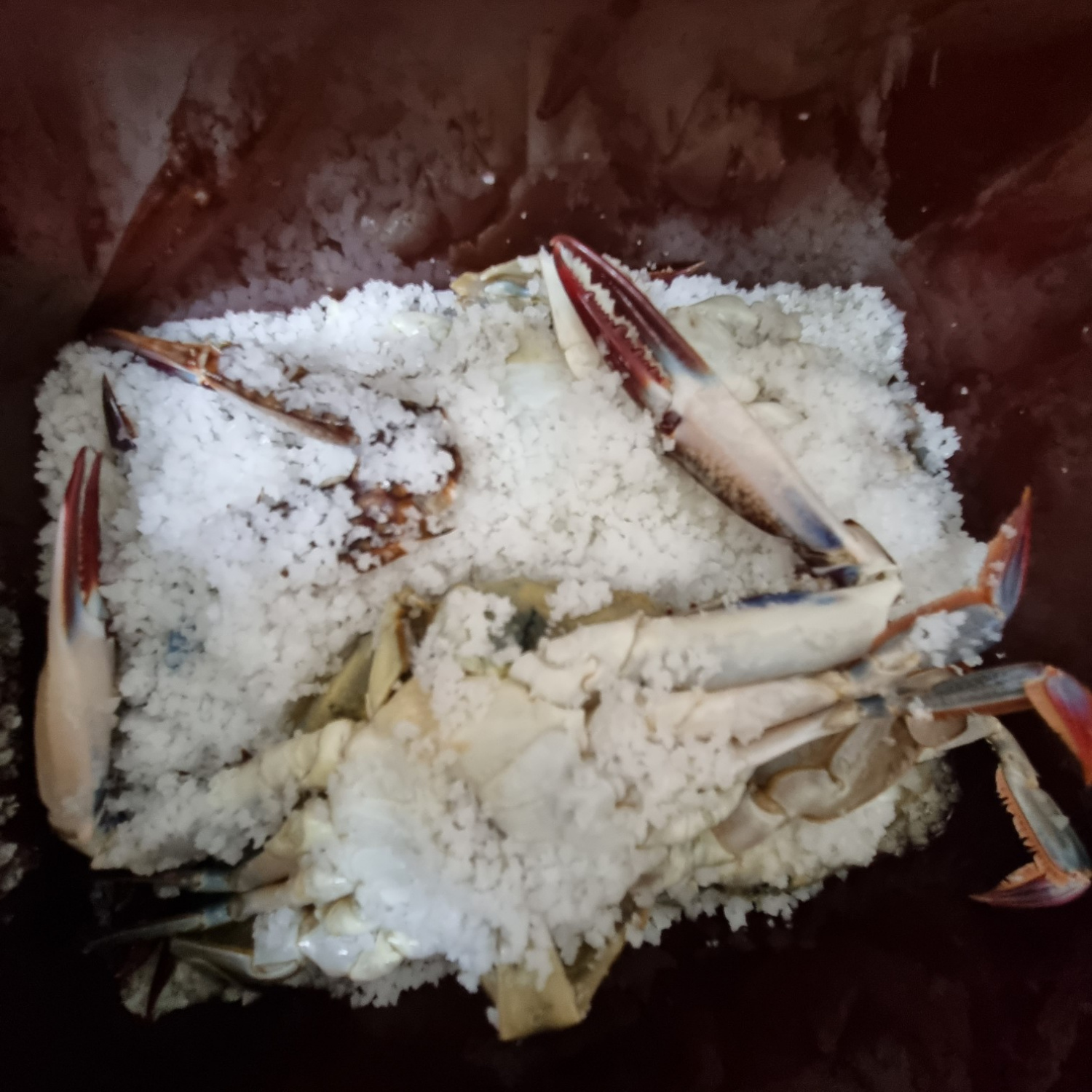 まず、新鮮な渡り蟹をきれいに洗うことが重要です。蟹の甲羅を開き、お腹側の殻を指で軽く押すと黒い内臓(「糞」)が出てくるので、これは必ず取り除いてください。もし生きた蟹を使用する場合は、安全のためにハサミや包丁でお腹の部分をしっかり押さえて仮死状態にしてから作業を始めることをお勧めします。ブラシを使って、蟹の隅々まで丁寧に洗いましょう。(私は便利な冷凍蟹を使用しました。)