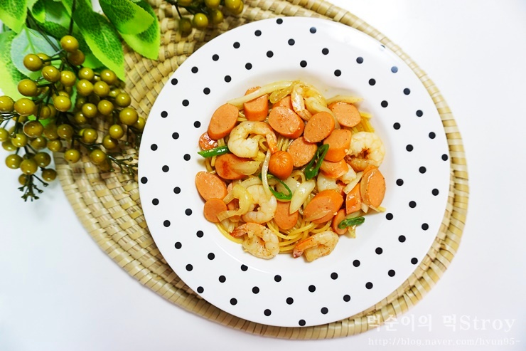 玉ねぎが透き通り、ハムとエビに火が通ってきたら、刻んだ青唐辛子を加えて、全ての材料が均一に混ざり合うように一緒に炒めます。青唐辛子のピリッとした辛さが加わり、さらに風味豊かになります。
