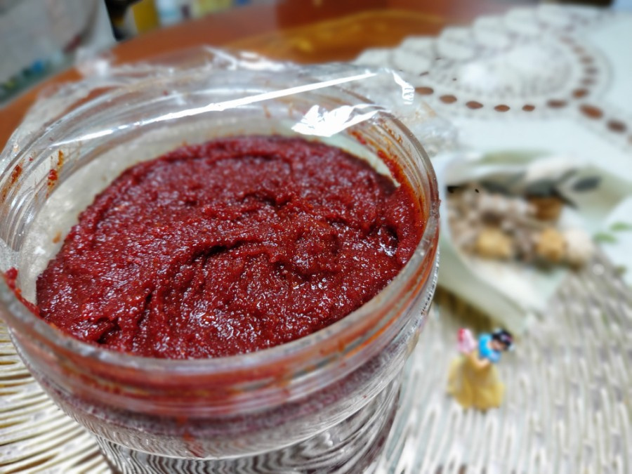 すべての材料を混ぜ合わせた後、約10分ほど置きます。もし生地が硬すぎると感じたら、用意しておいたソジュを少しずつ加えて、お好みの固さに調整してください。よく混ざったコチュジャンを、準備した保存容器に移します。容器の表面をラップで覆い、しっかりと蓋を閉めて、涼しい場所で約10日間熟成させれば、美味しい自家製コチュジャンのできあがりです!